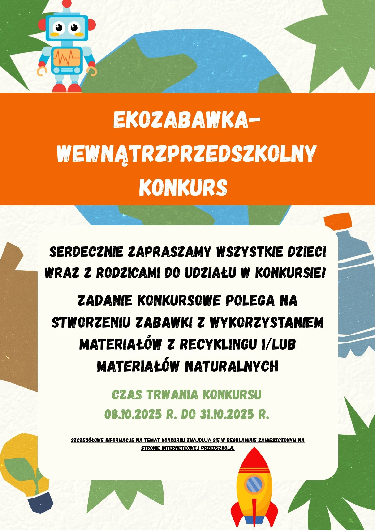 Serdecznie zapraszamy dzieci wraz z rodzicami do udziału w wewnątrzprzedszkolnym konkursie ,,EkoZabawka”. Zadanie konkursowe polega na stworzeniu zabawki z wykorzystaniem materiałów z recyklingu i/lub materiałów naturalnych.