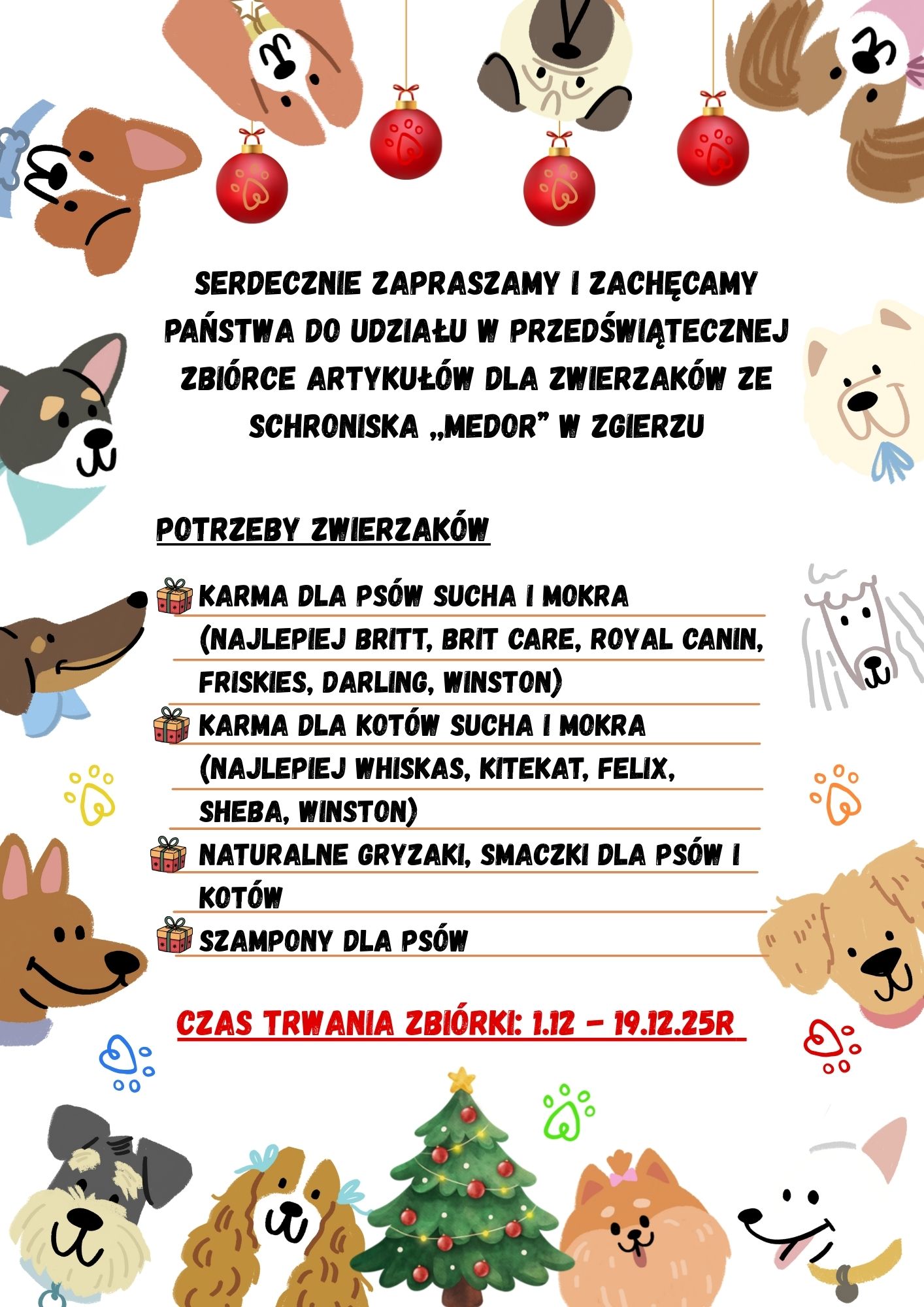 Serdecznie zapraszamy i Zachęcamy Państwa do udziału w przedświątecznej zbiórce artykułów dla zwierzaków ze schroniska ,,Medor” w Zgierzu. Szczegóły w plakacie.